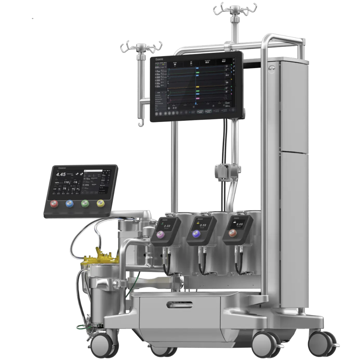 Az ESSENZ szív-tüdő motor egy moduláris felépítésű, kis helyigényű 3 + 2 + 1 pumpamodult (3 db 150 mm-es + 2 db 85 mm-es és 1 db centrifugál pumpa, összesen 5+1 pumpafej) tartalmazó készülék, mely a műtőben könnyen elhelyezhető és mozgatható, az eddig használt eszközöknél és a kompetitor készülékeknél kisebb helyigényű, valamint ergonómikus munkahelyet biztosít a készüléket kezelő szakemberek számára. A konzol maximum 8 db pumpa szimultán elhelyezését biztosítja. A hálózati csatlakozó kábel a készülék bármelyik oldalán kivezethető ezzel is biztosítva az ideális elhelyezést és a műtőbeli balesetek megelőzését.
